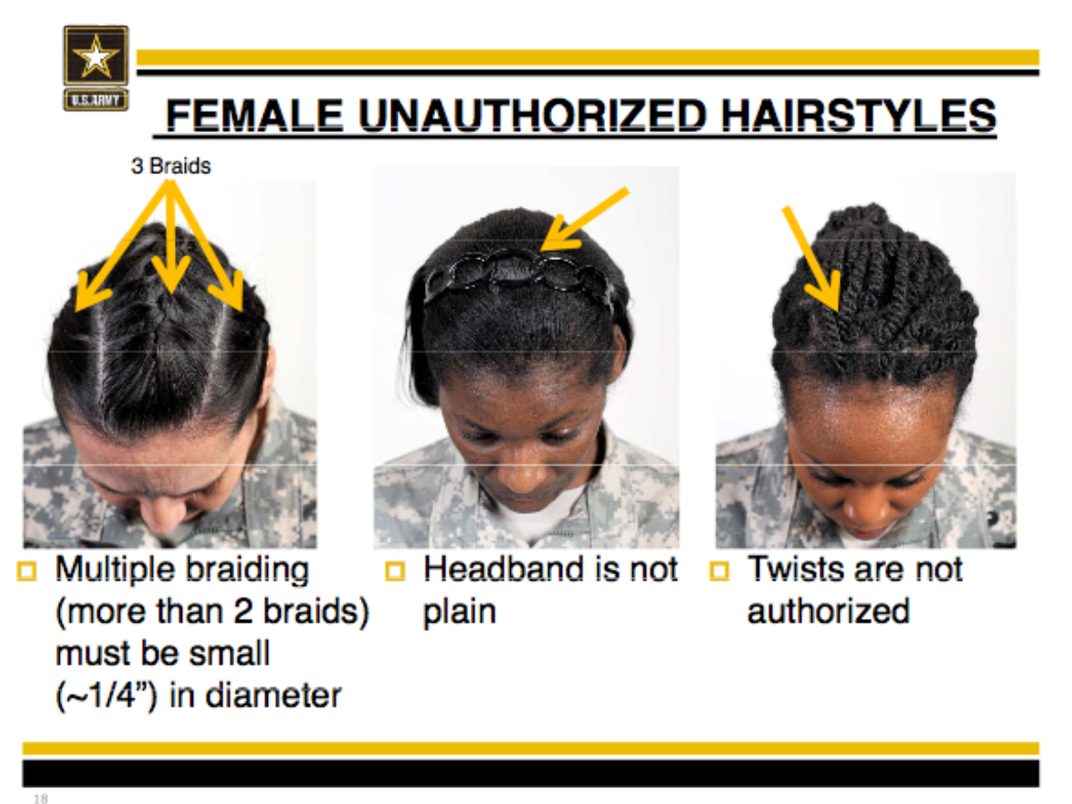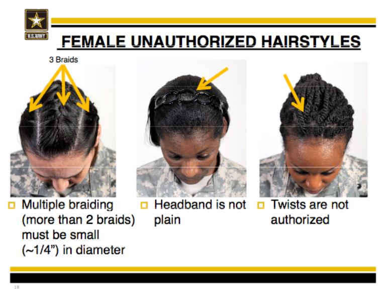 Lançado na segunda-feira, 7 de abril, o artigo 670-1 das regulações do Exército inclui várias regras que tratam especificamente de penteados como torções, tranças e tiaras que são populares entre as mulheres negras.