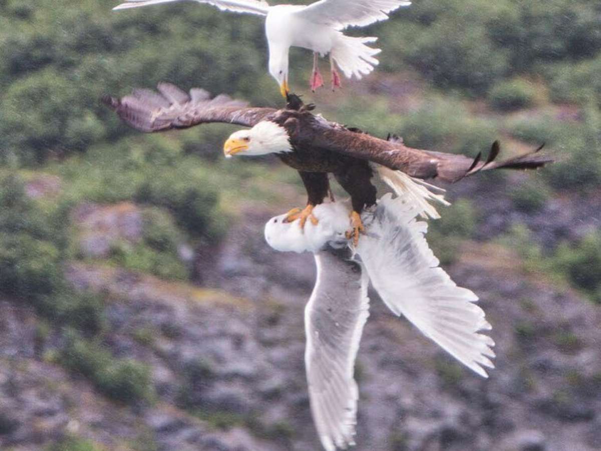 Na foto é possível ver uma das gaivotas totalmente dominada pela ave de rapina, enquanto outra ave bica a águia, em solidariedade à ave capturada. Não há informações sobre o desfecho da batalha entre as aves, mas o mais provável é que a gaivota tenha sido realmente abatida.