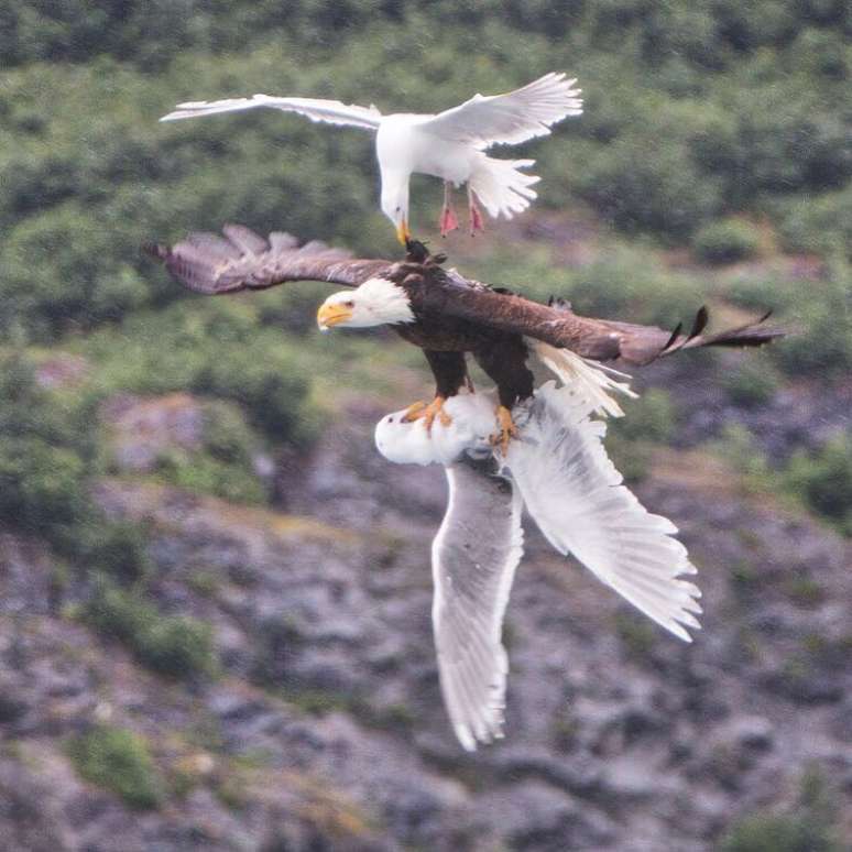 Uma imagem publicada no perfil do Instagram do Departamento do Interior dos Estados Undidos nessa quarta-feira chamou a atenção dos internautas. A imagem, feita pelo fotógrafo David Canales, registra uma gaivota tentando salvar um companheiro de espécie das garras de uma Águia no estado do Alasca.