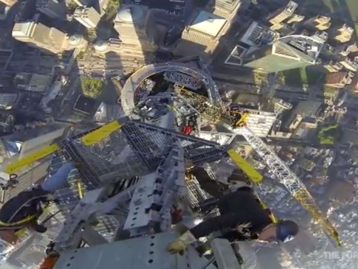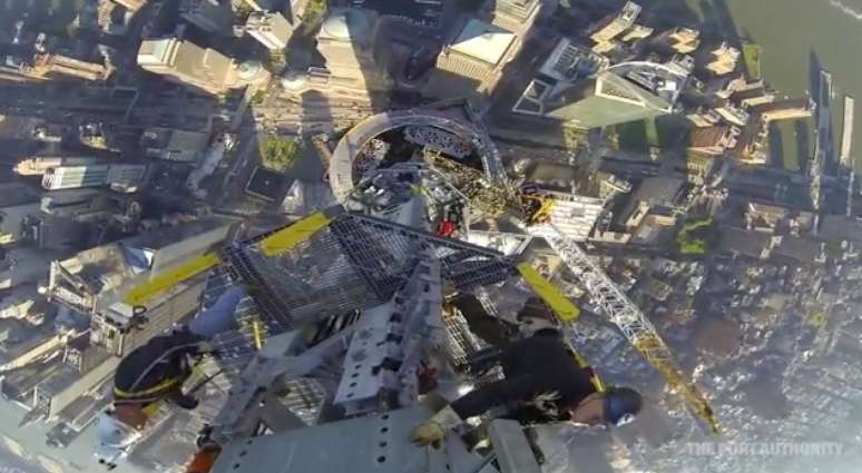 Imagem mostra a subida do pináculo instalado no topo da torre. O prédio substitui as Torres Gêmeas, destruídas nos ataques do 11 de setembro de 2001. No entanto, o lugar exato onde estavam os antigos prédios se transformou em um memorial em lembrança às vítimas dos atentados