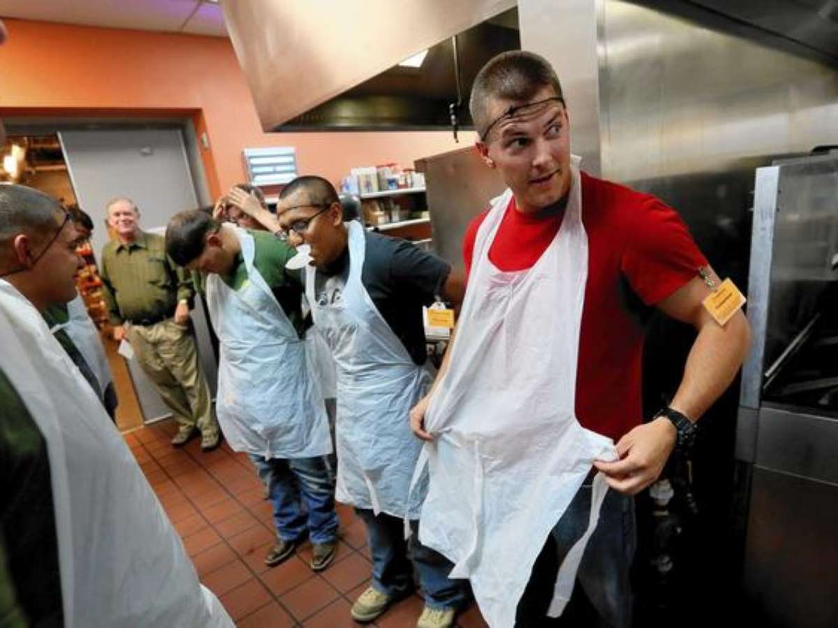 Os militares serviram ovos mexidos e hambúrgueres aos desabrigados que estão alojados no St. Vincent de Paul Village, um alojamento que abriga cerca de 900 moradores de rua, no centro de San Diego. Dentre eles, 167 são veteranos.