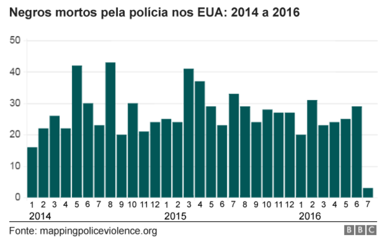 Dados do projeto "Mapping Police Violence" (Mapeando a violência policial, em tradução literal), mostram que a probabilidade de negros serem mortos pela polícia nos EUA é três vezes maior que a de brancos.