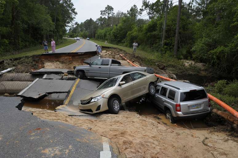 Carros ficaram empilhados uns sobre os outros na Rodovia Dog Track, na comunidade de Millview, por conta das tempestades que atingiram a cidade de Pensacola, no estado da Flórida