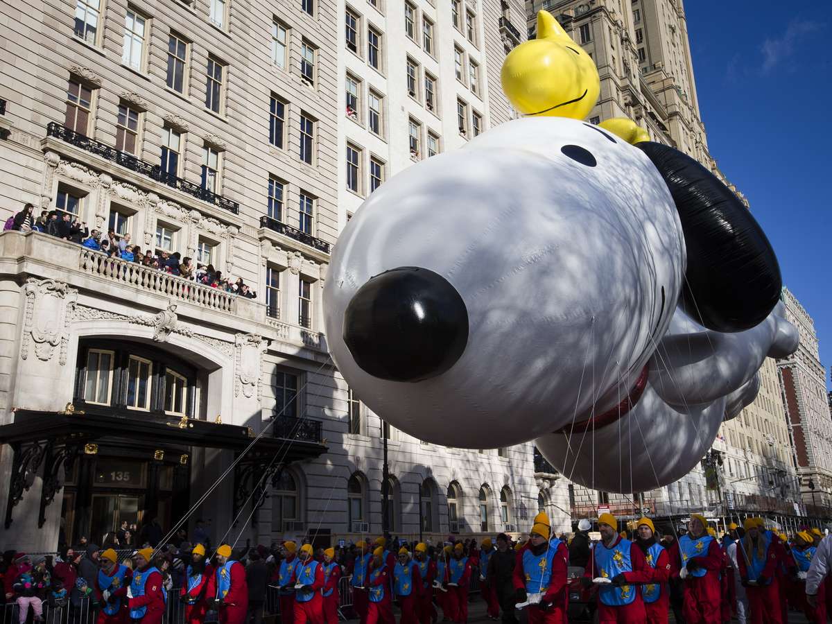 Balão gigante do personagem Snoopy desfila diante de multidão durante a tradicional parada de Ação de Graças em Nova York. Artistas, pessoas fantasiadas e balões gigantes animaram o público que aproveitou o feriado nos Estados Unidos para acompanhar a 87ª edição Macy's Thanksgiving Day Parade na 6ª Avenida de Nova York