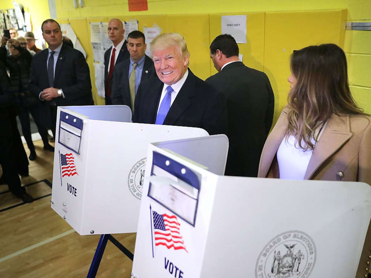 O magnata nova-iorquino chegou pouco antes das 11h locais (14h em Brasília) a uma escola pública do centro de Manhattan, perto do arranha-céu Trump Tower, onde votou acompanhado de sua mulher, Melania Trump.