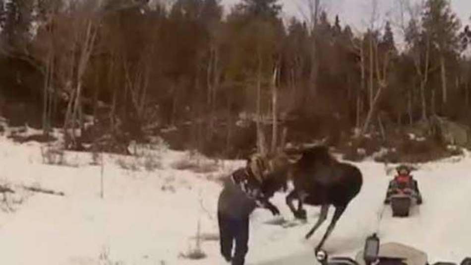 Estados Unidos Casal é surpreendido por alce em corrida de moto na neve Exibir comentários Compartilhar Casal praticava moto na neve em Maine (EUA), quando um alce correu atrás de Bob; a esposa Janis, que filmou tudo, deu um tiro para cima para espantar o animal CNN Publicidade