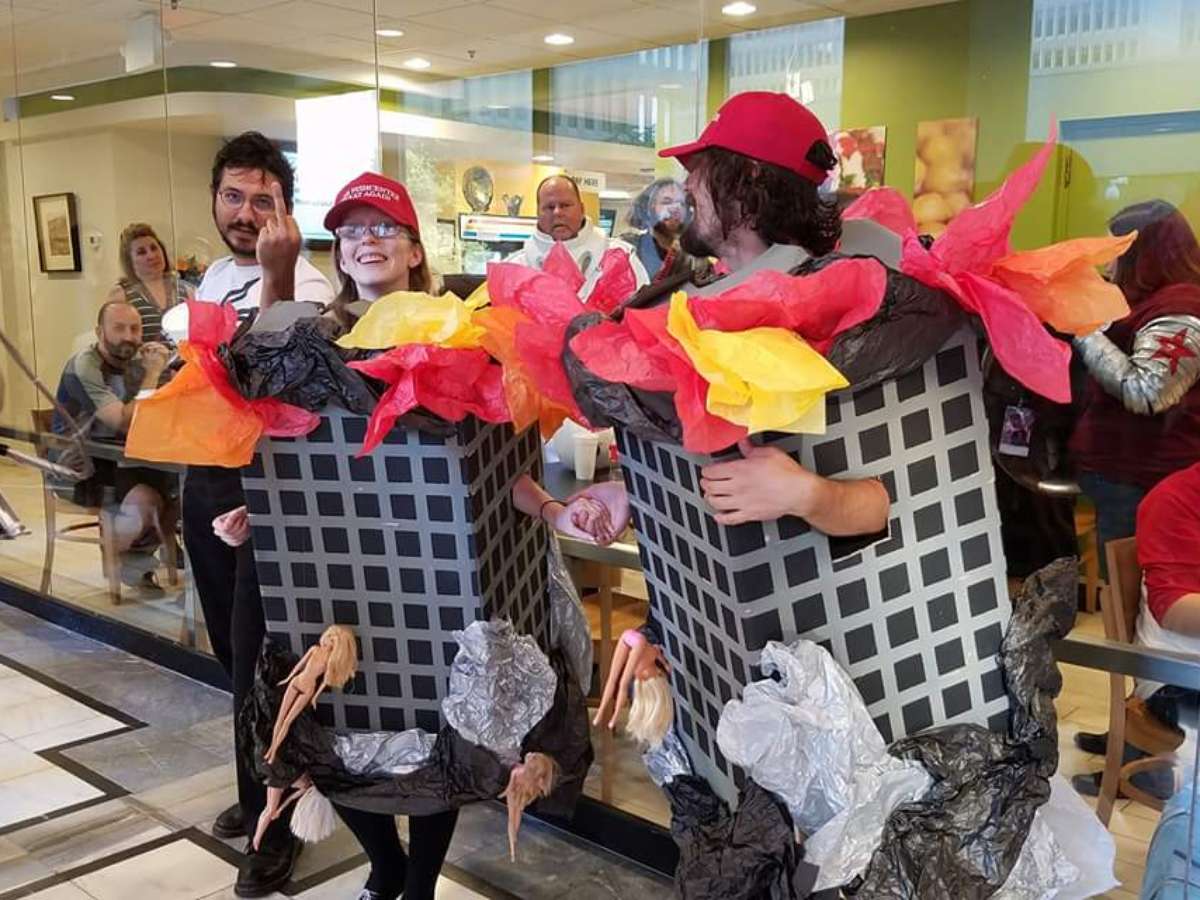 As fantasias eram feitas de papelão, com papel crepe representando as chamas e bonecas “caindo” do edifício. A Dragon Con é uma das maiores convenções de cultura pop no mundo e, segundo seus organizadores, costuma atrair cerca de 70 mil visitantes por ano.