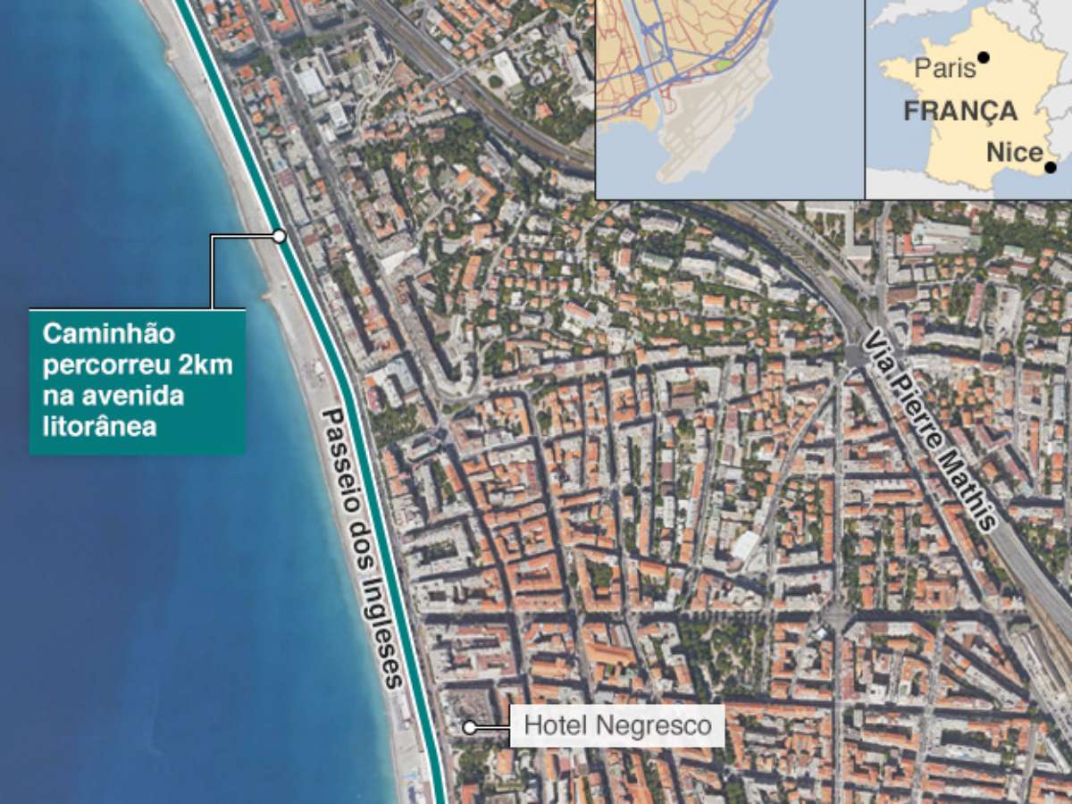 O atentado ocorreu por volta das 23h locais (18h de Brasília), quando um caminhão em alta velocidade avançou sobre a multidão que tinha acabado de assistir a uma queima de fogos na Promenade des Anglais, a principal avenida beira-mar de Nice, no sul da França.