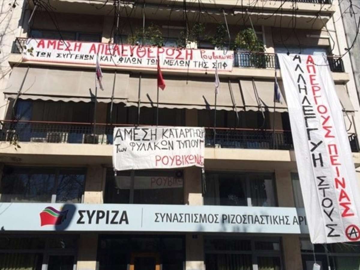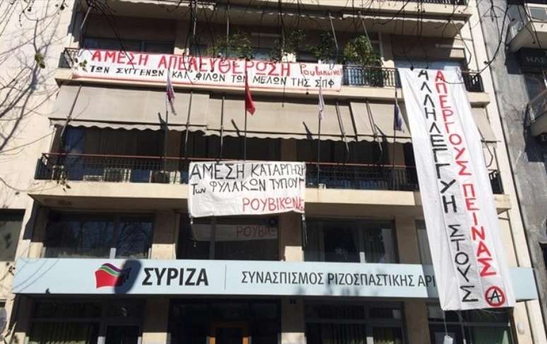 Cerca de cinquenta anarquistas ocuparam neste domingo a sede do partido governista de esquerda radical, Syriza, em apoio a uma greve de fome de prisioneiros que protestam contra as suas condições de vida nas prisões de alta segurança.