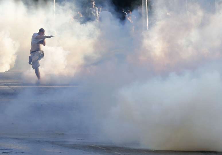 - 1º de junho - Homem usa um estilingue contra a polícia de choque durante protesto contra o governo na Turquia