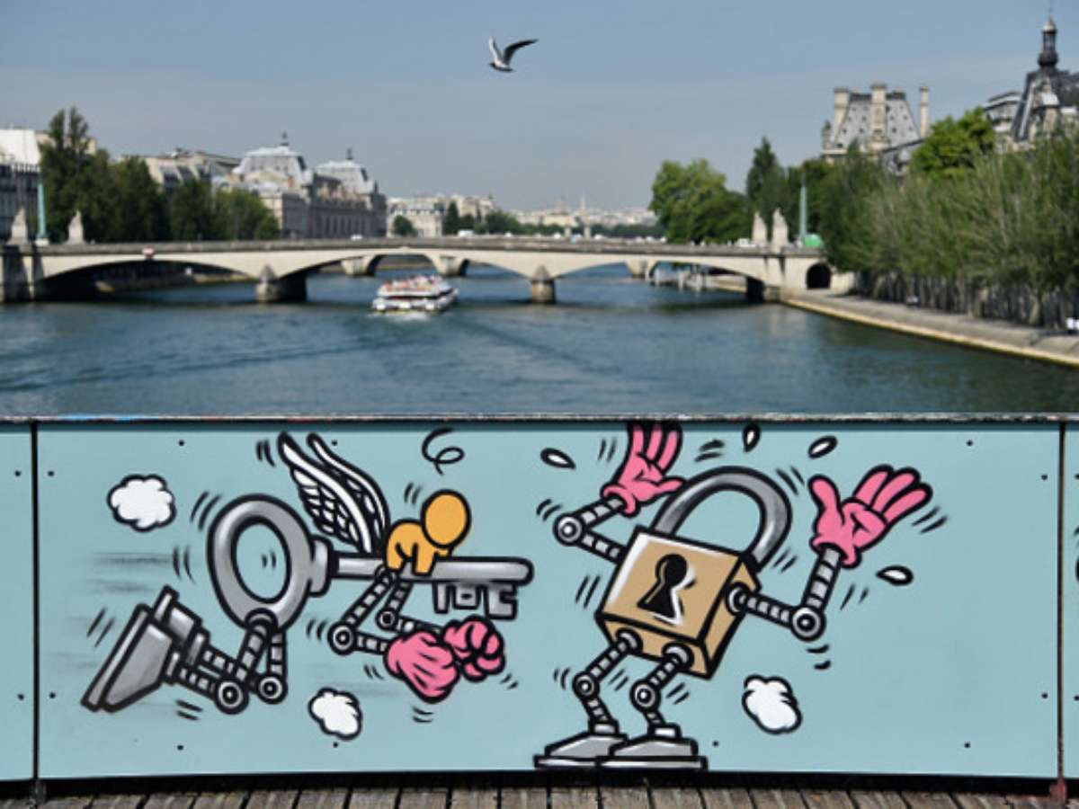 Painéis de arte de rua foram instalados na Pont des Arts de Paris para substituir os “cadeados do amor”, que estavam instalados na ponte até a cidade começar a retirá-los na semana passada, temendo que seu peso acumulado causasse danos na estrutura.