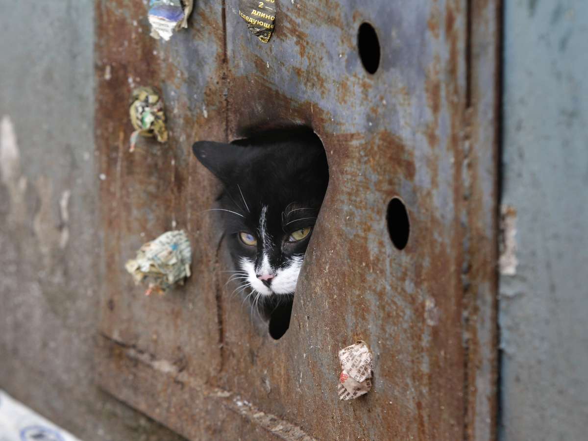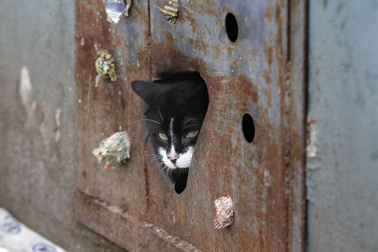 Gato de rua deixa prédio por buraco aberto em placa de metal que cobre janela de porão em Minsk, na Bielorrússia. Recentemente, as autoridades da cidade começaram a prender gatos em porões de prédios e a lacrar as janelas para impedir que eles saiam. A medida foi tomada com base em uma lei sanitária de 1990, quando o país ainda estava sob o regime soviético. No entanto, moradores locais contrários à iniciativa oficial têm aberto buracos nas placas de metal para alimentar os animais e permitir que eles deixem os porões