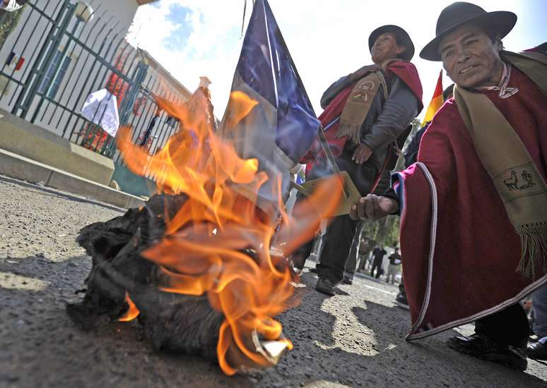 Mais de cem manifestantes queimaram nesta quarta-feira duas bandeiras da França e jogaram pedras contra a embaixada francesa na Bolívia para protestar contra a proibição temporária aos voos aéreos do presidente Evo Morales, constatou um jornalista da AFP. Entre os manifestantes, havia civis e indígenas, convocados por organizações ligadas ao governo.