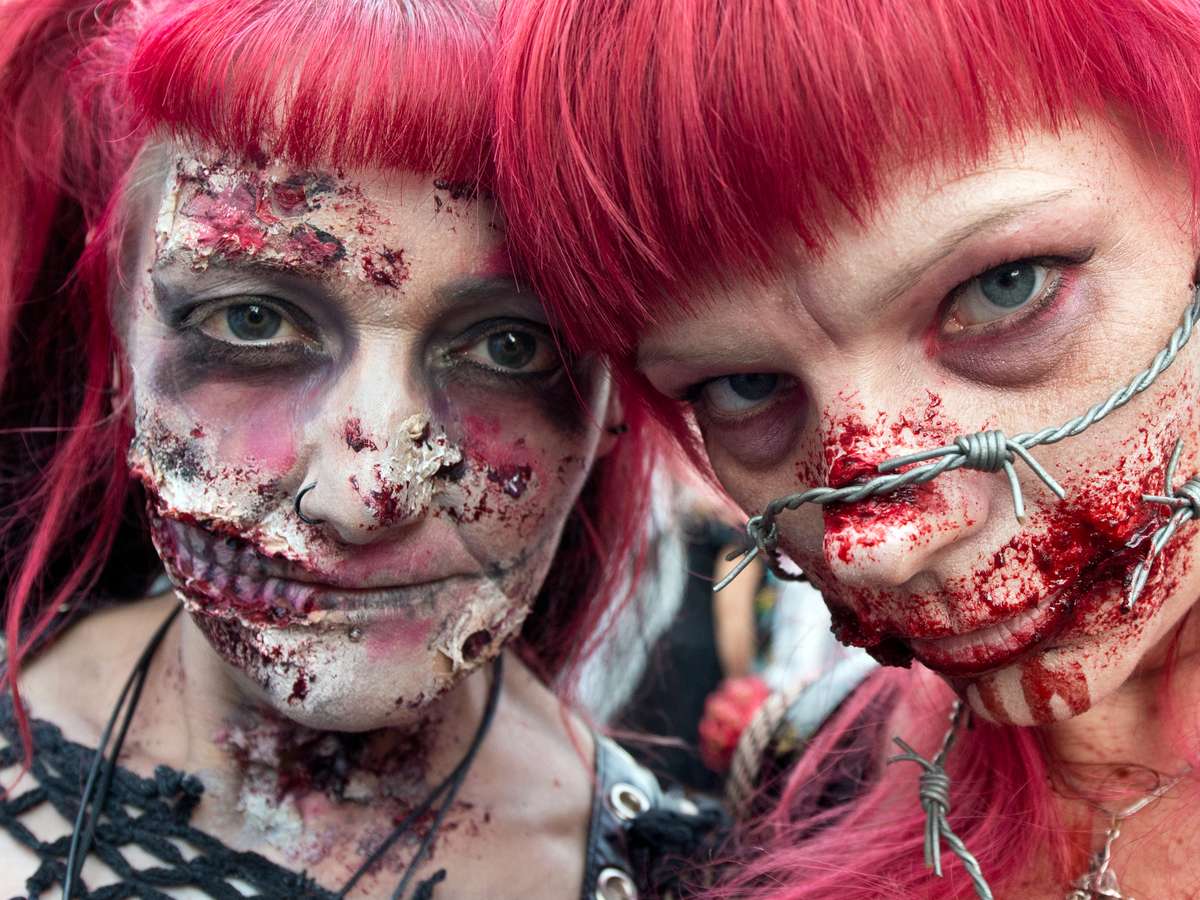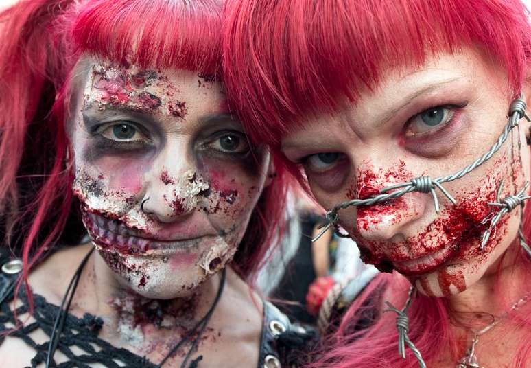 Participantes fantasiados participam da "Zombie Walk" (Caminhada Zumbi, na tradução livre) em frente à principal estação de trem de Frankfurt, na Alemanha, neste sábado. O evento convocado pela internet atraiu dezenas de fãs dos mortos-vivos popularizados em filmes, na TV, em quadrinhos e jogos de videogame. Os participantes chamaram a atenção pelos detalhes e pelo capricho das fantasias