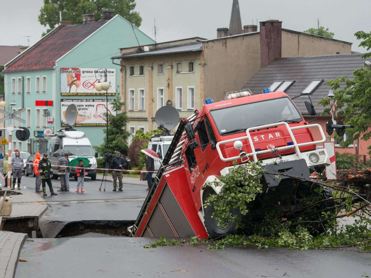 Um caminhão dos bombeiros foi engolido por uma cratera aberta em uma rua de Glucholazy, no sudoeste da Polônia. A cidade foi atingida por um forte temporal na noite dessa quarta-feira, o que provocou o incidente. De acordo com a Polskie Radio, mais de cem casas foram inundadas