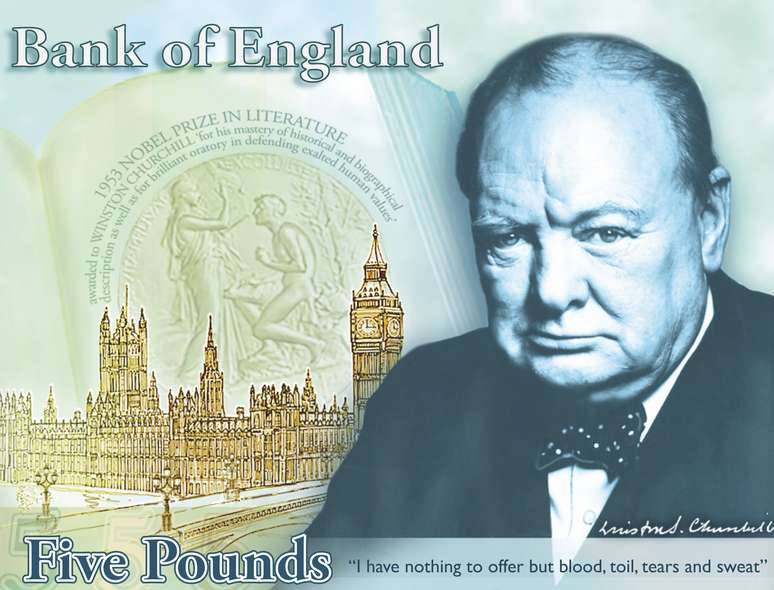 A Grã-Bretanha irá homenagear o reverenciado estadista Winston Churchill em uma nova nota de 5 libras a ser lançada em 2016, e que trará a efígie do político e sua frase mais famosa - "Não tenho nada a lhes oferecer senão sangue, trabalho, lágrimas e suor".