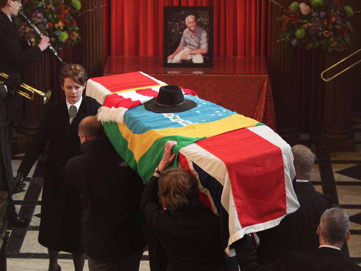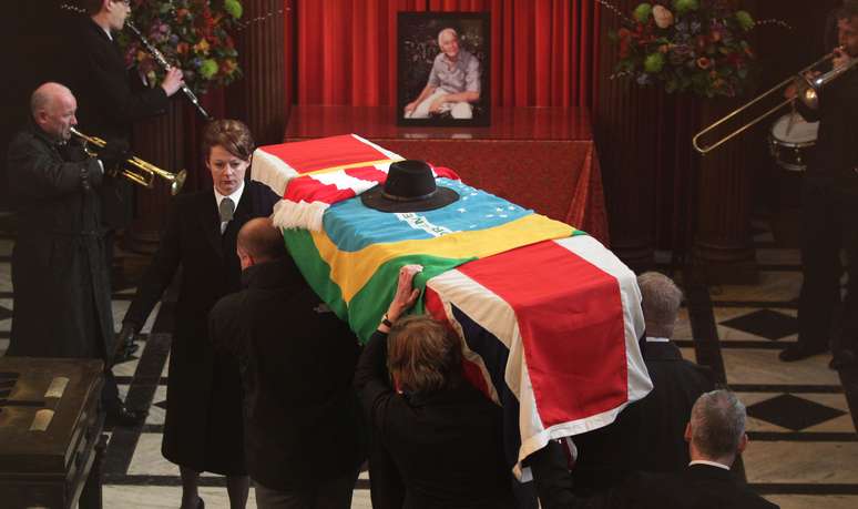 Enrolado na bandeira do Brasil, o caixão de Ronald Biggs é colocado em posição para ser cremado no Crematório Goldes Green, no norte de Londres. Biggs, conhecido pela sua participação no assalto do século ao trem pagador, em 1963, morreu no dia 18 de dezembro. Ele passou décadas no Brasil para escapar da prisão no Reino Unido, o que o tornou um dos criminosos mais famosos do mundo