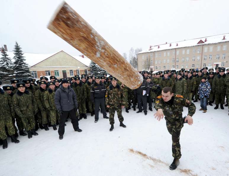 PUBLICIDADE Capa Notícias Mundo Europa As Principais Notícias da Europa Competição militar marca Dia dos Defensores da Pátria na Bielorrússia Compartilhar Recruta do exército da Bielorrússia arremessa um tronco de madeira durante as atividades para marcar o Dia dos Defensores da Pátria Foto: AFP Recruta do exército da Bielorrússia arremessa um tronco de madeira durante as atividades para marcar o Dia dos Defensores da Pátria Foto: AFP Jovens participam da disputa de um cabo de guerra no centro de treinamentos de Okolitsa, a cerca de 30 quilômetros de Minsk Foto: AFP A competição entre os recrutas é uma tradição no Dia dos Defensores da Pátria Foto: AFP Nem o frio desta época do ano desanimou os competidores Foto: AFP Os superires orientavam os jovens nas disputas de grupo Foto: AFP Um dos recrutas utilizou uma máscara de gás para participar das atividades Foto: AFP A Bielorrússia, assim como outros países que formavam a antiga União Soviética, comemoram o Dia dos Defensores da Pátria em 23 de fevereiro Foto: AFP Compartilhar Publicidade Compartilhar TAGS As Principais Notícias da Europa Notícias Mundo Publicidade
