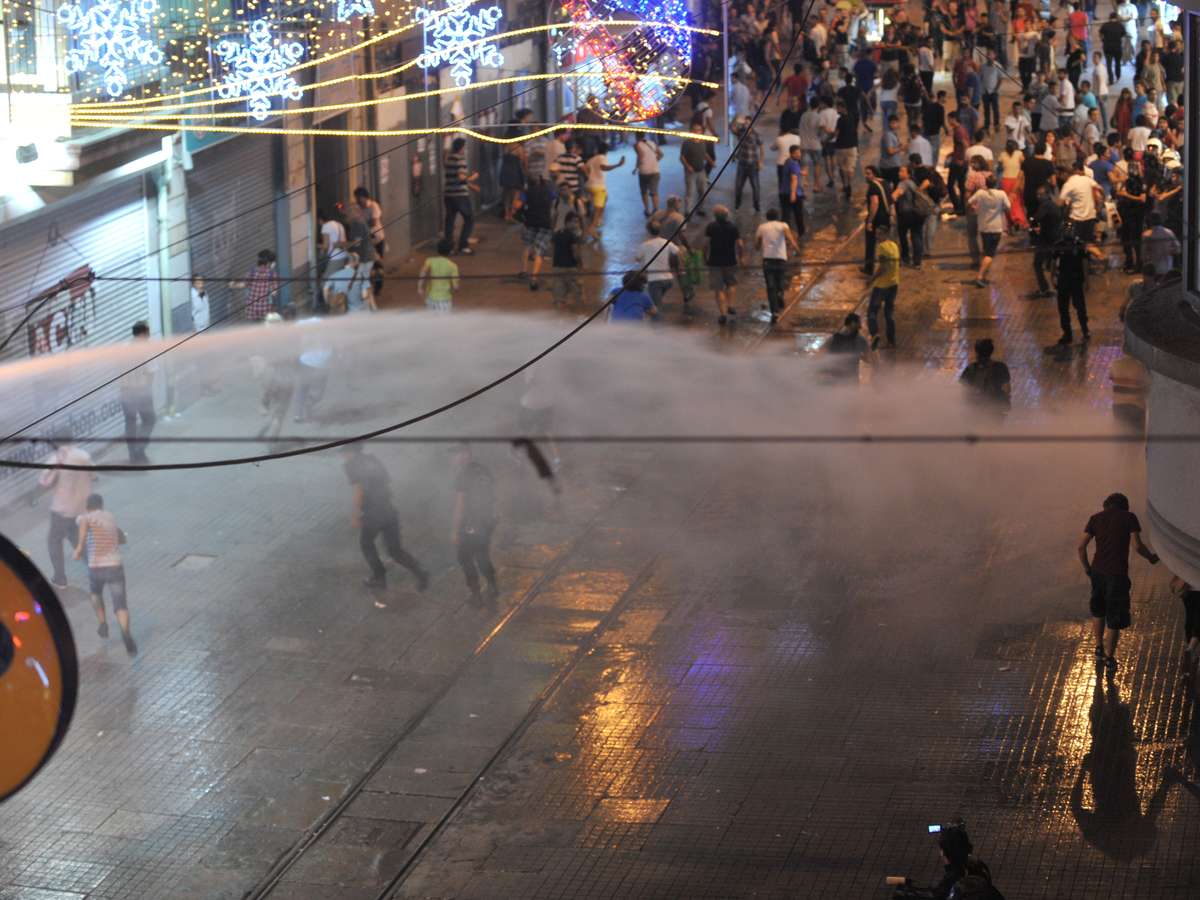 11 de junho - Homem é atingido por jato d'água disparado pela polícia na tentativa de conter os protestos que voltaram a se transformar em confontos em mais um dia de tensão na Turquia