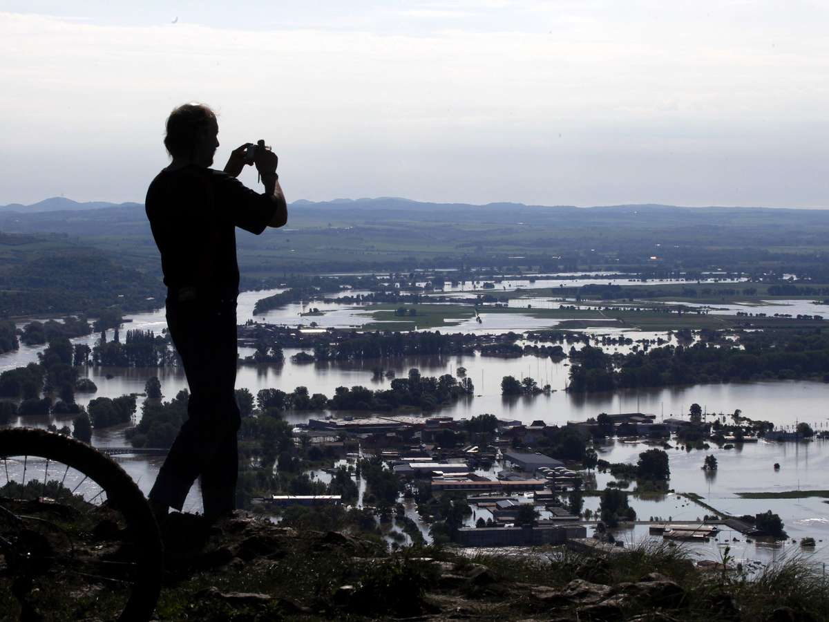 5 de junho - Homem tira fotos de área alagada pelo Rio Elba, em Litomerice, na República Checa