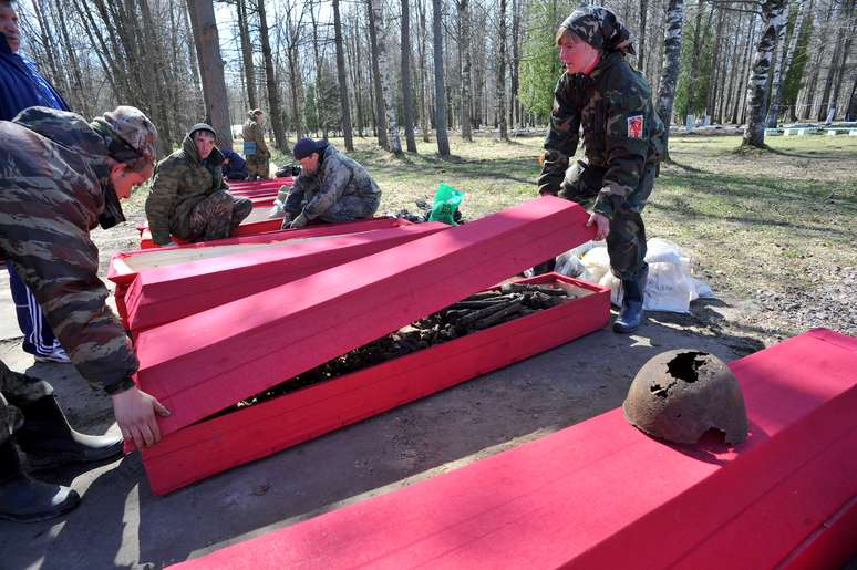 PUBLICIDADE Capa Notícias Mundo Europa As Principais Notícias da Europa Encontrados corpos de soldados russos 68 anos após fim da 2ª Guerra Restos mortais de integrantes do Exército Vermelho foram localizados perto de São Petersburgo, no leste da Rússia Compartilhar Os restos mortais de 244 soldados do Exército Vermelho da Rússia serão sepultados nesta terça-feira, aniversário do fim da Segunda Guerra Mundial Foto: AFP Os restos mortais de 244 soldados do Exército Vermelho da Rússia serão sepultados nesta terça-feira, aniversário do fim da Segunda Guerra Mundial Foto: AFP Os restos mortais foram encontrados por uma equipe de especialistas perto da segunda maior cidade da Rússia, São Petersburgo Foto: AFP Os soldados morreram em confrontos com as tropas alemãs que invadiram a União Soviética em junho de 1941 Foto: AFP Muitos corpos de soldados mortos no campo de batalha nunca tinham sido localizados Foto: AFP Neste dia 7 de maio faz 68 anos que a Alemanha assinou o termo de rendição, pondo fim à Segunda Guerra Mundial Foto: AFP Compartilhar Publicidade Compartilhar TAGS As Principais Notícias da Europa Notícias Mundo Publicidade