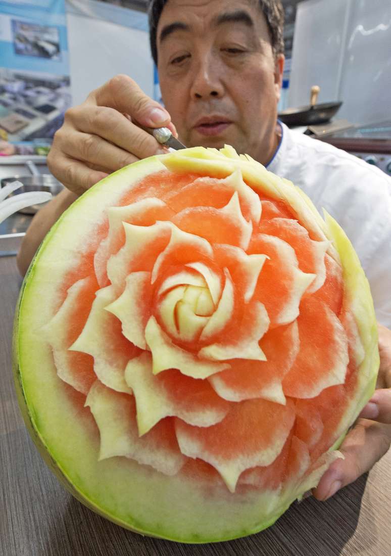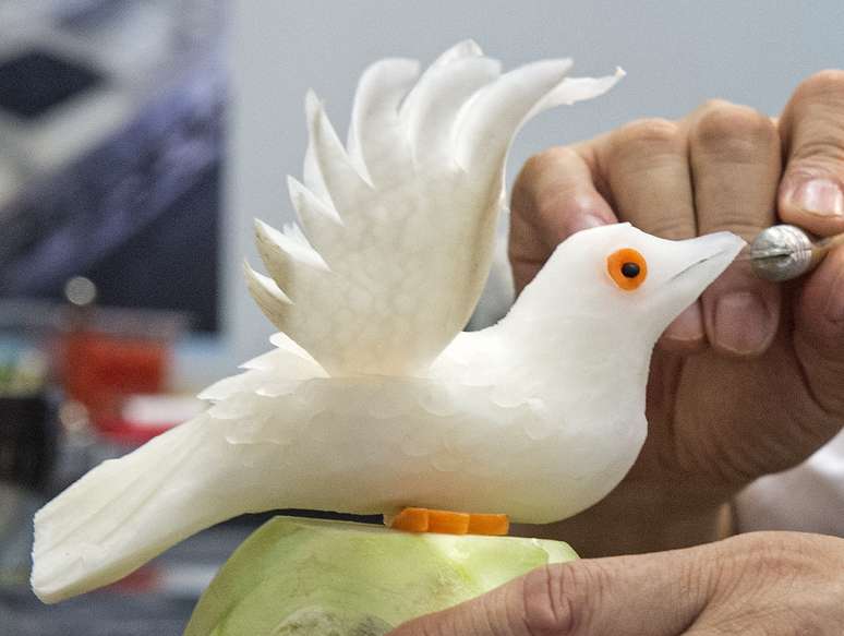 O artista chinês Xiang Wang, campeão mundial em esculturas de alimentos, construiu um pássaro feito de rábano - um vegetal conhecido como nabo japonês. Outra obra de Wang na edição deste ano do festival é uma flor feita de melancia.