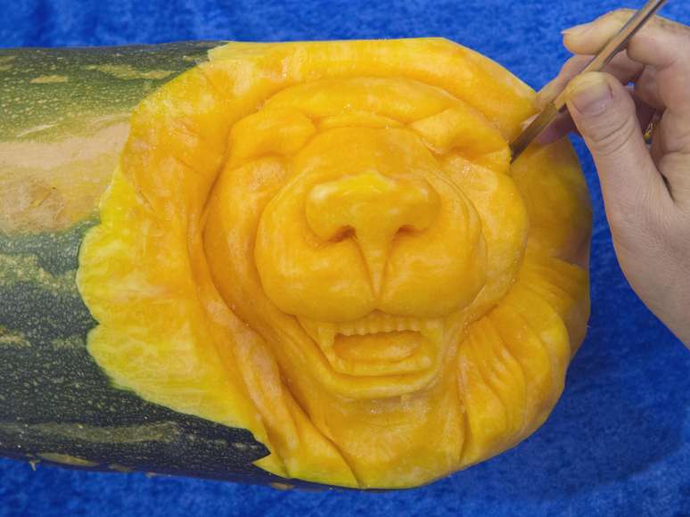 Outra escultura que chamou a atenção dos visitantes do evento foi essa cabeça de leão, esculpida em uma abóbora. O nome do autor da obra não foi divulgado.