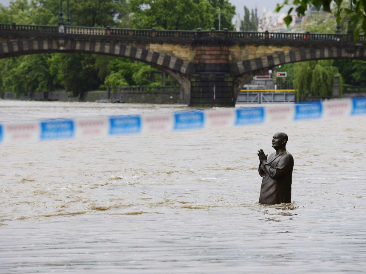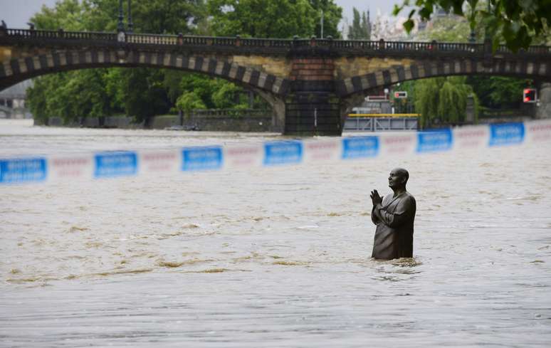 3 de junho - Estátua é vista parcialmente submersa devido à cheia do rio Vltava, em Praga