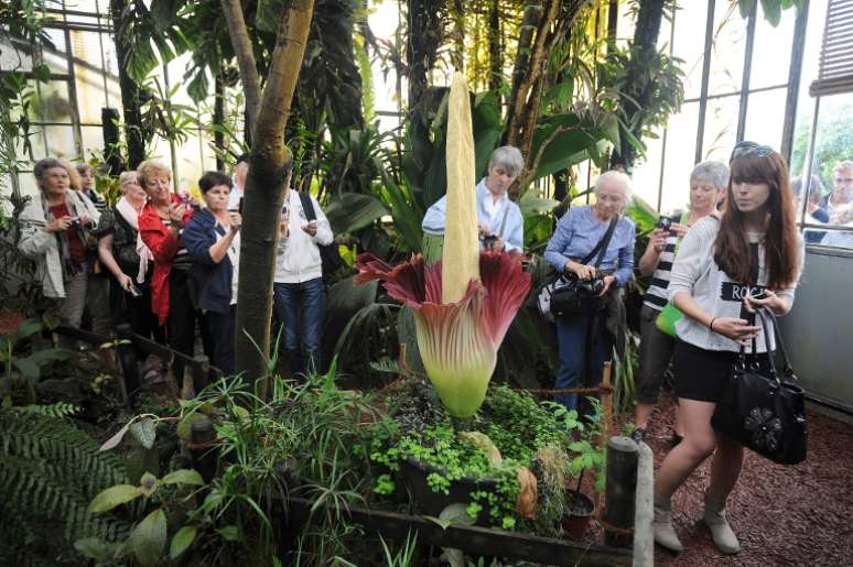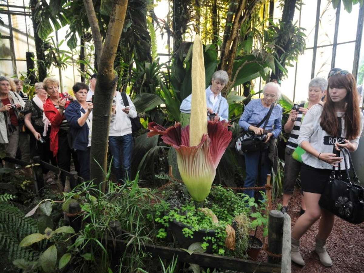 Pessoas correram para ver a "Amorphophallus titanum", no Jardim Botânico da cidade, antes do início da florescência, no domingo.