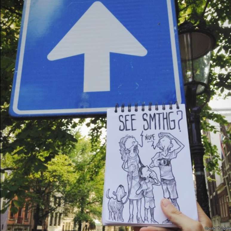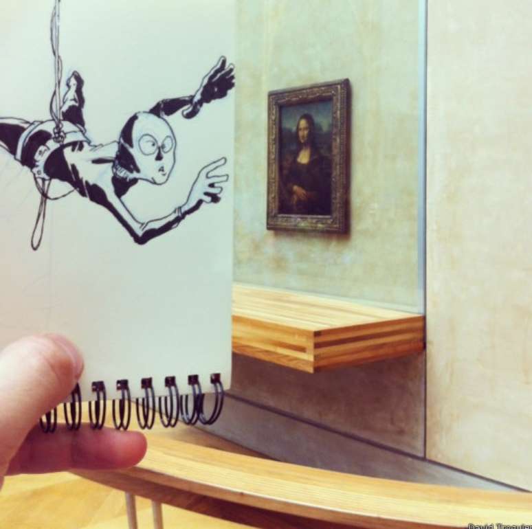 Um artista francês está fazendo sucesso na internet com fotos em que insere desenhos em lugares e cenas banais do cotidiano. Ao lado, David Troquier, também conhecido como “Troqman”, faz um selfie 'ilustrado'.