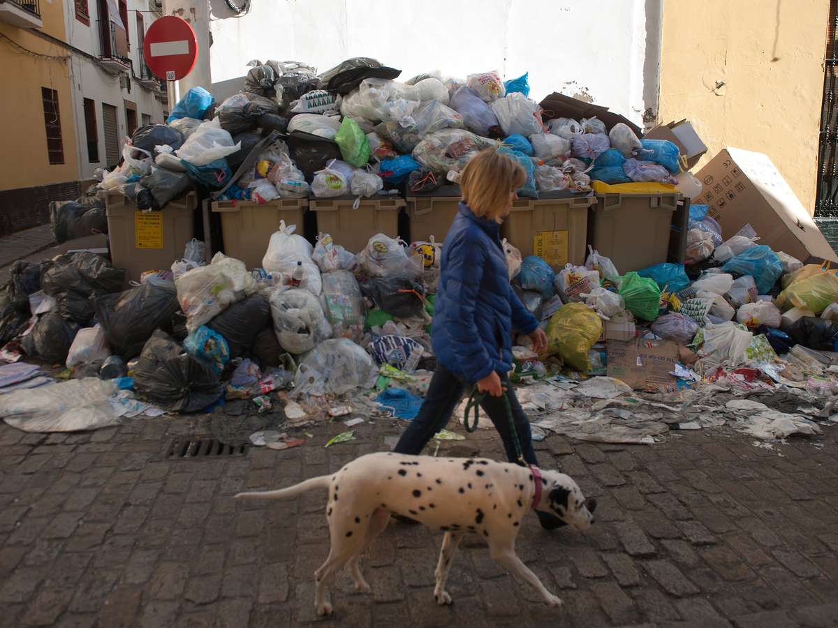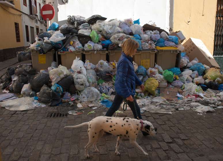 Pedestre passa por pilha de lixo durante o décimo dia de greve de recolhedores de dejetos em Sevilha, na Espanha. Trabalhadores entraram em uma paralização para protestar contra cortes de salário de 5% e aumento da jornada de trabalho para 37h30 por semana