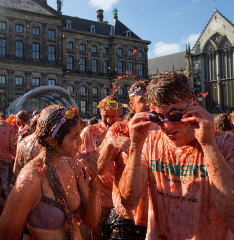 Fruto é arremessado por todos os lados, durante a guerra de tomates, em Amsterdã