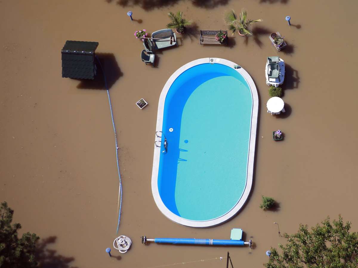 10 de junho - Imagem mostra contraste entre área inundada e piscina com as águas límpidas em Magdeburg, na Alemanha