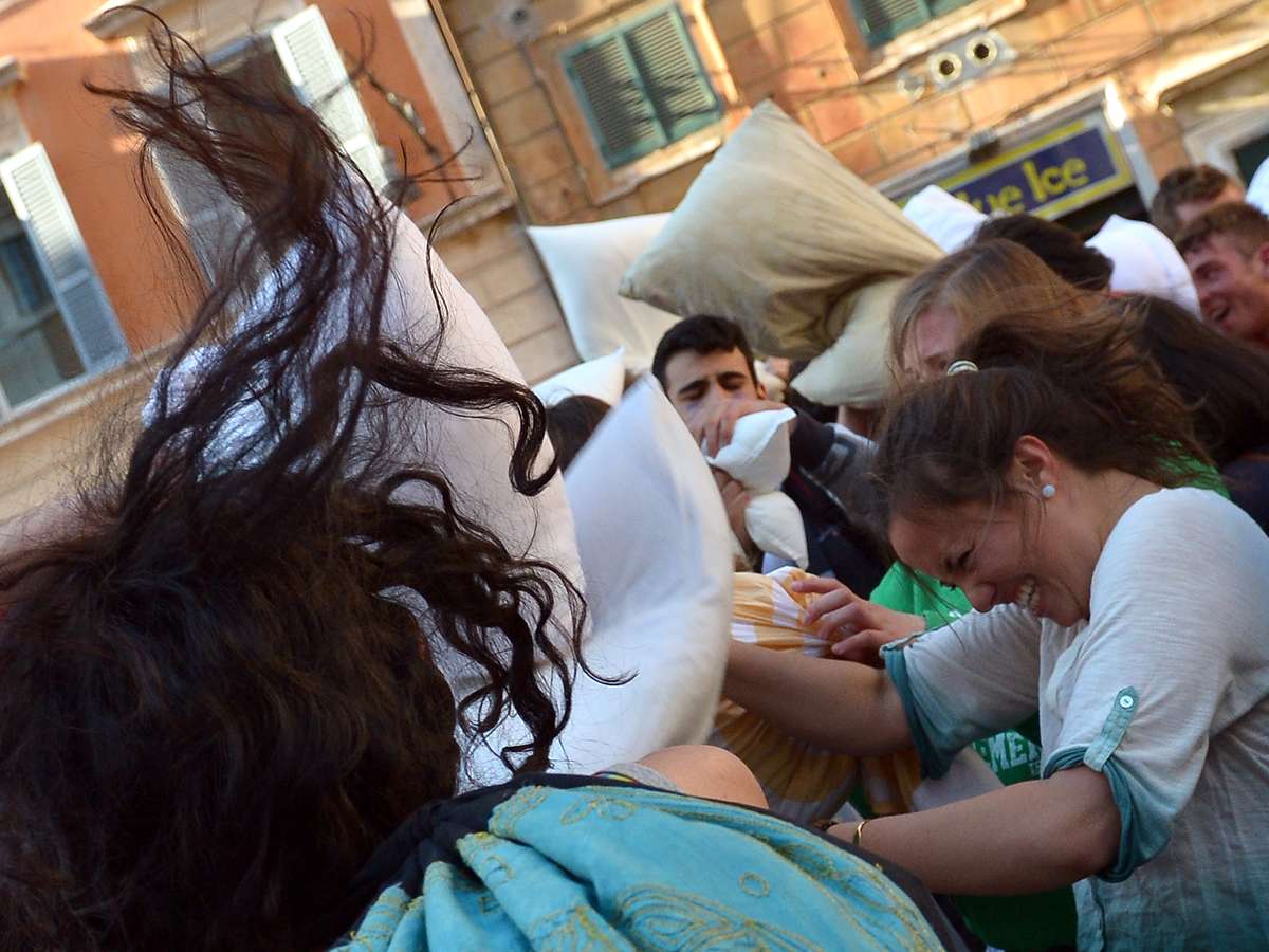 Italianos participaram, neste domingo, da 8ª edição da Guerra de Travesseiros de Roma. A brincadeira reuniu dezenas de pessoas na Praça Santa Maria, em Trastevere