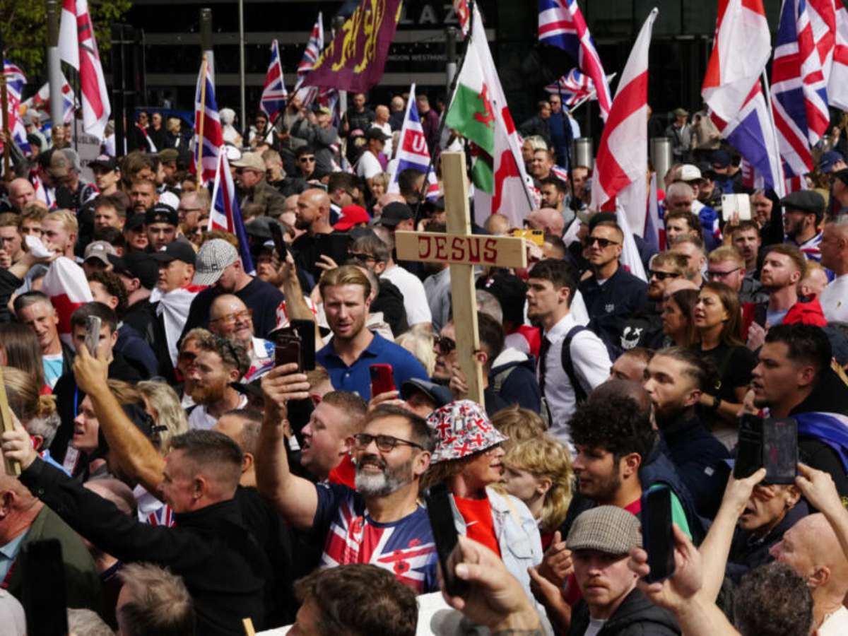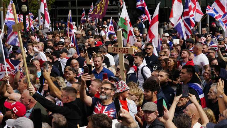 Imagens aéreas transmitidas por emissoras de televisão mostraram um mar de bandeiras britânicas e inglesas inundando as ruas do centro da capital. Os manifestantes entoavam slogans anti-imigrantes e exigiam a saída do primeiro-ministro, o trabalhista Keir Starmer.