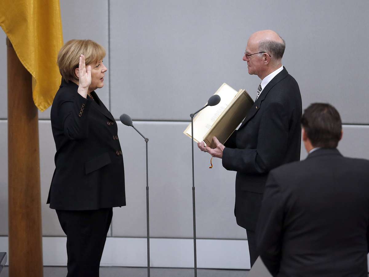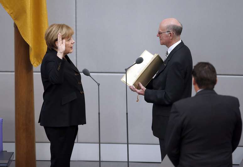 PUBLICIDADE Capa Notícias Mundo Europa As Principais Notícias da Europa Merkel toma posse para 3º mandato como chanceler da Alemanha Angela Merkel foi reeleita Alemanha para uma terceira legislatura após o acordo de coalizão entre o bloco conservador e os sociais-democratas Compartilhar A chanceler alemã Angela Merkel (esq.) presta juramento ao tomar posse para seu terceiro mandato no Parlamento alemão, em Berlim Foto: AP A chanceler alemã Angela Merkel (esq.) presta juramento ao tomar posse para seu terceiro mandato no Parlamento alemão, em Berlim Foto: AP Merkel sorri ao ser fotografada em um dos assentos do Parlamento após ser reeleita Foto: AP O presidente alemão, Joachim Gauck (dir.), entrega a Merkel uma carta de indicação Foto: AP Merkel recebe flores após ser reeleita chanceler da Alemanha Foto: AP Merkel vota na eleição para chanceler no Parlamento alemão, o Bundestag, em Berlim Foto: AP Merkel é aplaudida por membros da governo durante primeira reunião após sua reeleição como chanceler da Alemanha Foto: Reuters Merkel é congratulada após ser reeleita Foto: Reuters Merkel recebe certificado de indicação das mãos de Gauck no Palácio de Bellevue, em Berlim Foto: AFP Compartilhar Publicidade Compartilhar TAGS As Principais Notícias da Europa Notícias Mundo Publicidade