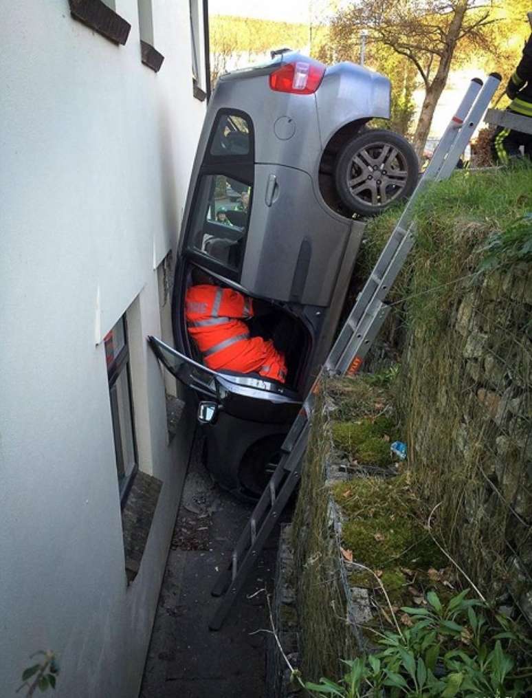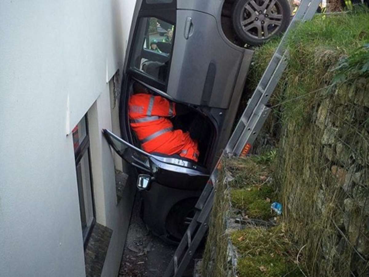 Um motorista teve que ser resgatado por bombeiros após um acidente de carro no condado de Devon, no sudoeste da Inglaterra. A vítima ficou presa dentro de um carro, que terminou em posição vertical, entre uma casa e uma parede, após o acidente. As informações são do Mirror.