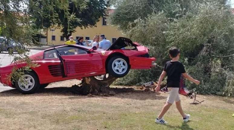 O impacto do acidente foi tão grande que uma oliveira acabou retirada do chão. A frente da Ferrari foi completamente danificada.