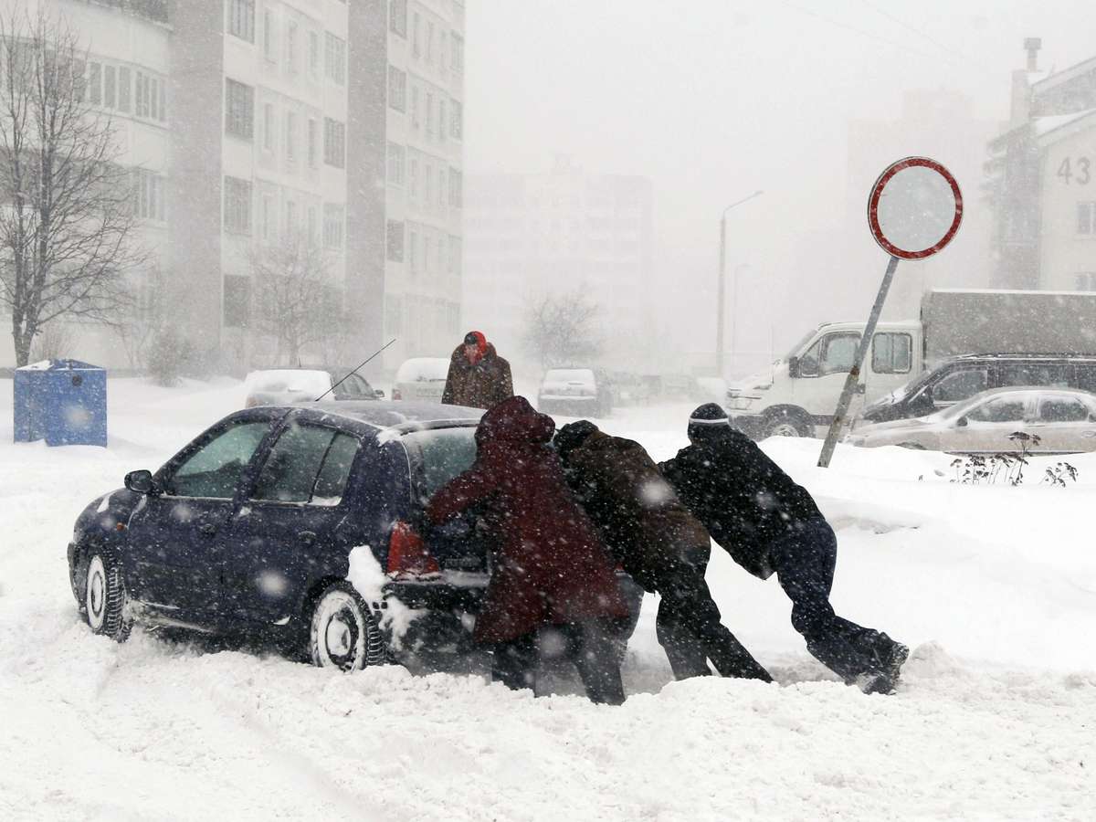 Pessoas empurram carros atolados enquanto intensa neve cai sobre Lviv, na UcrâniaFoto: AFP