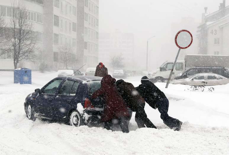 Pessoas cobrem seus rostos enquanto caminham durante intensa tempestade de neve em Minsk, capital da Bielorrússia. O tempo frio e ventoso marcou esta sexta-feira na cidadeFoto: Reuters