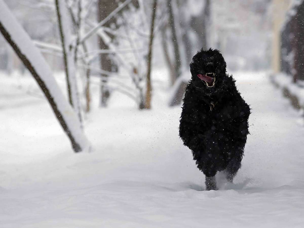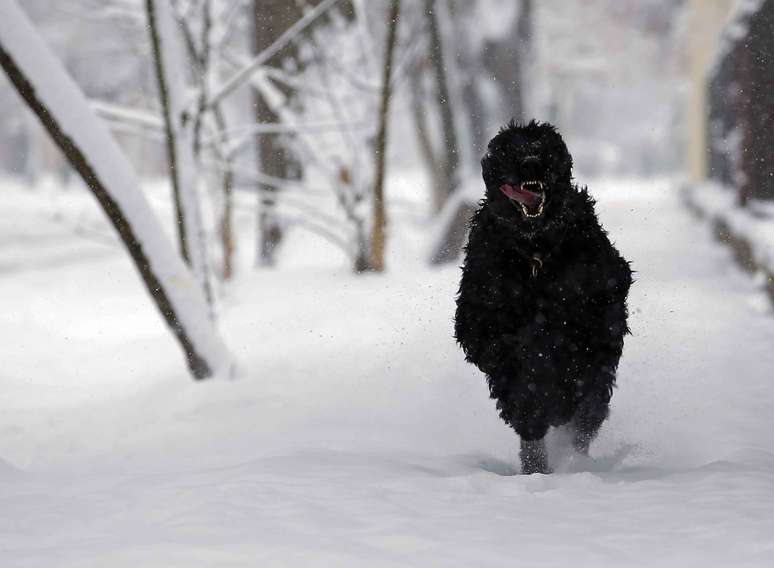 Cão corre em rua coberta pela neve de Budapeste, na Hungria. Nos últimos anos, a capital húngara foi atingida por uma incomum onda de frio para esta época do ano