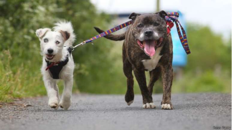 Tudo porque Glenn, um cão da raça jack russel terrier, é cego e, por isso, está sempre ao lado de Buzz, um staffordshire bull terrier que age como se fosse seu cão-guia.
