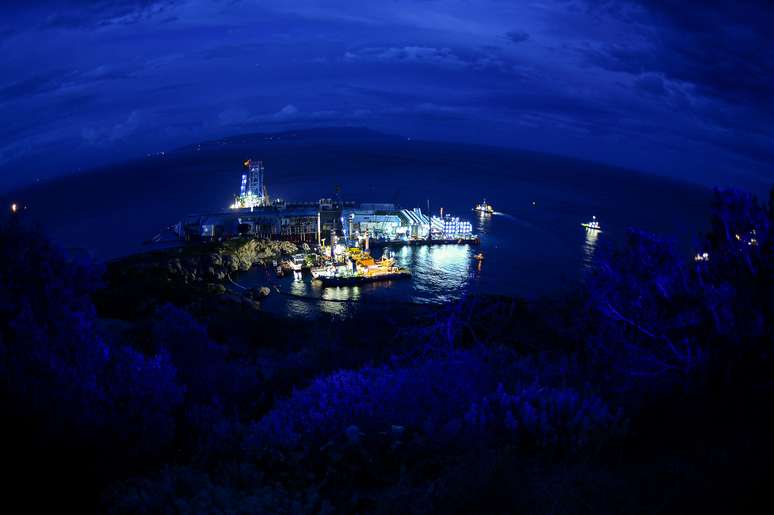 16 de setembro - Imagem tirada da praia de Ilha de Giglio mostra o navio encalhado no horizonte