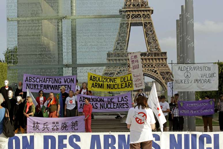 Pacifistas fizeram nesta terça-feira uma manifestação diante do Muro da Paz, em Paris, para lembrar o 68º aniversário do lançamento da bomba atômica pelos Estados Unidos na cidade japonesa de Hiroshima, no final da 2ª Guerra Mundial