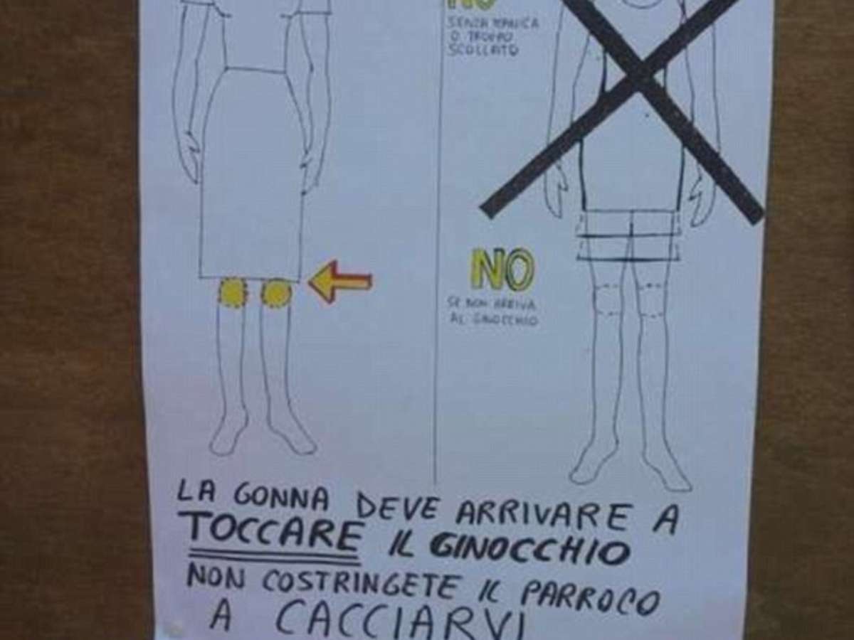 Um padre italiano se cansou dos vestidos e saias curtas desfilando em sua igreja e baniu as mulheres, de vez, de aparecer com vestimentas ‘indecentes’. Para isso, tentou ser bastante didático e deixou um desenho explicativo para as fiéis. As informações são do Daily Mail.