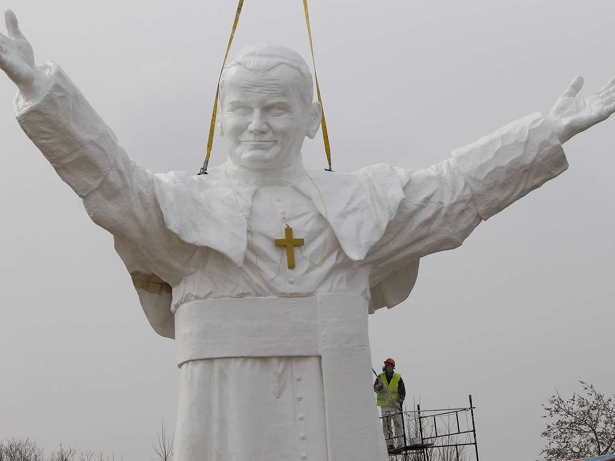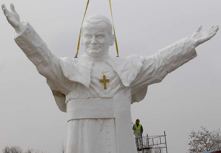 Trabalhador dá os retoques finais em estátua gigante do papa João Paulo II que deve ser inaugurada nesta semana em Czestochowa, na Polônia. A escultura de 13,8 m de altura, feita de fibra de vidro, está sendo instalada junto ao monastério de de Jasna Gora, principal ponto de peregrinação católica do país. A obra, que traz João Paulo II sorrindo e com os braços abertos para o mundo, foi patrocinada por um investidor privado