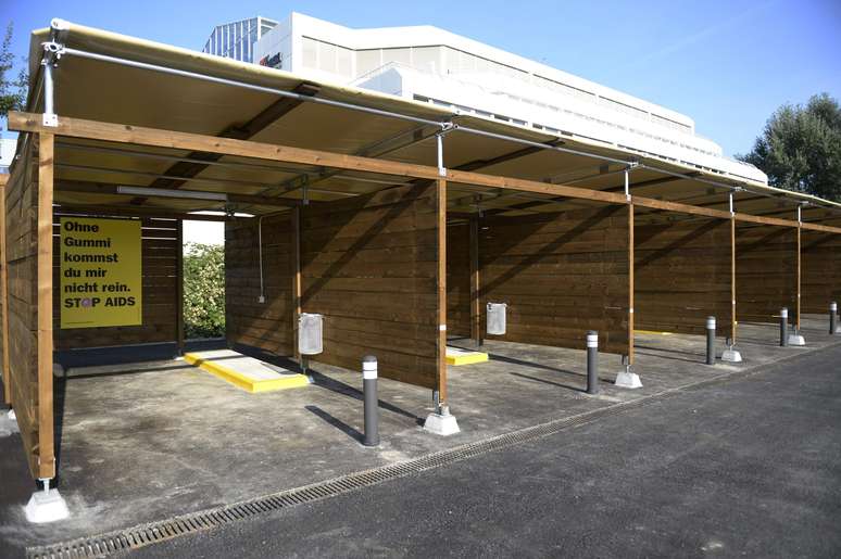 Essas 11 cabines, parecidas com lava-jatos, são equipadas com banheiros com chuveiros, e contam com um botão de alarme para o caso de a prostituta se sentir em risco.