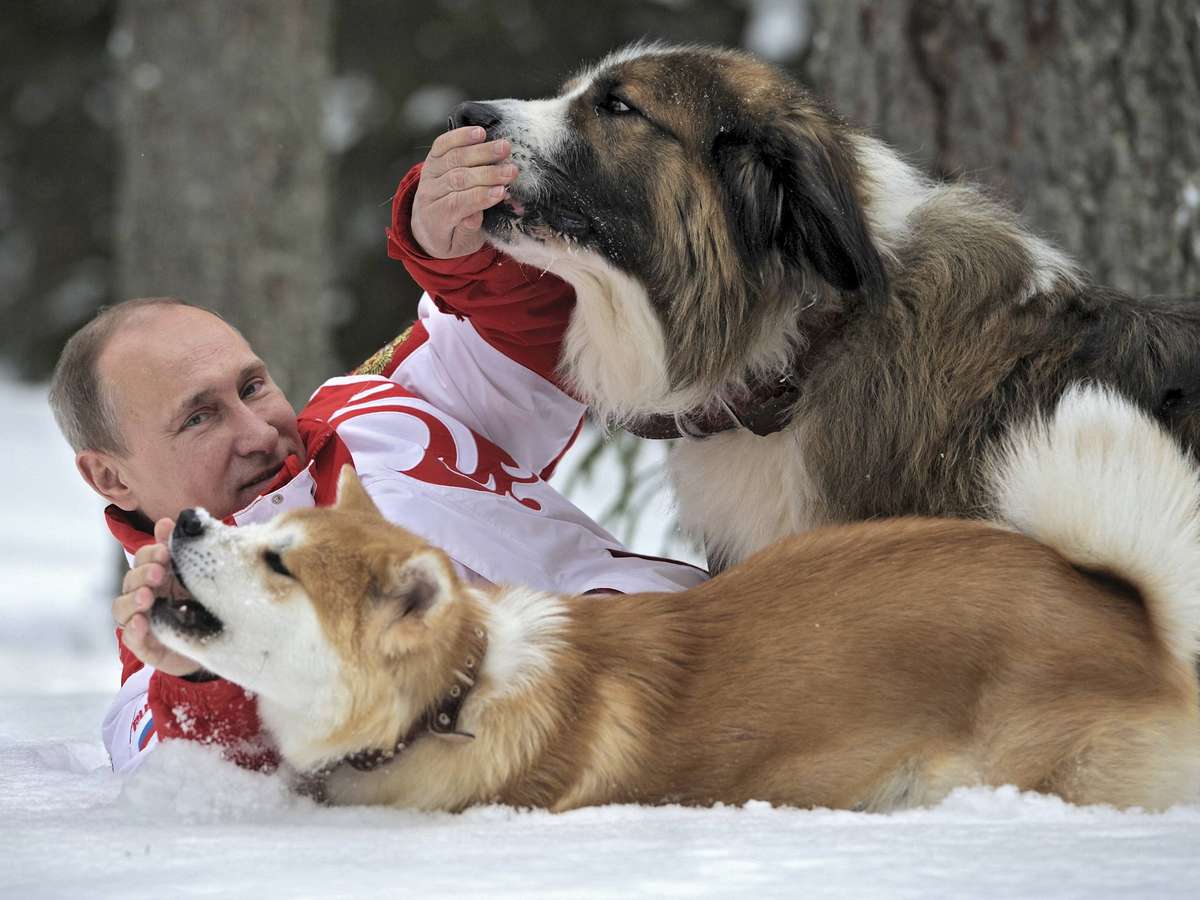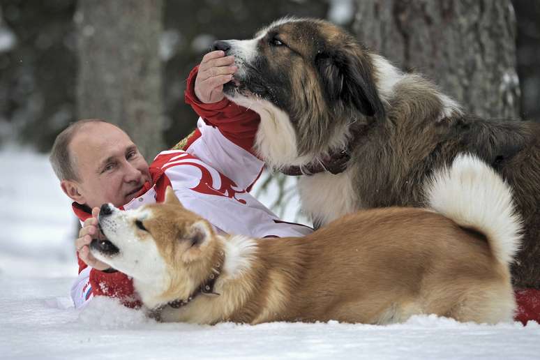 O presidente da Rússia, Vladimir Putin, brinca com seus cães de estimação durante caminhada em parque coberto pela neve na região de Moscou. O forte líder russo, frequentemente acusado de autoritarismo e por suprimir a oposição do país, costuma ser fotografado em momentos de lazer na natureza e com animais