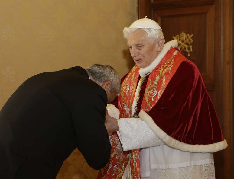 Papa Bento XVI é cumprimentado pelo cardeal Angelo Sodano, decano do colégio de cardiais da Igreja Católica, logo após o anúncio da renúncia neste dia 11 de fevereiro