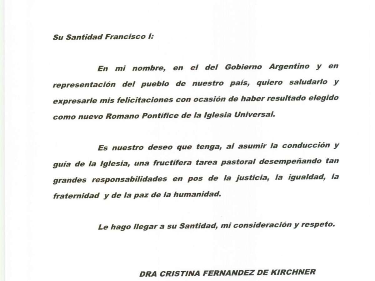 "É nosso desejo que tenha, ao assumir a condução e guia da Igreja, um frutífero trabalho pastoral desempenhando tão grandes responsabilidades em prol da justiça, da igualdade, da fraternidade e da paz da Humanidade", indicou a breve carta de Kirchner, de religião católica, mas mantém uma fria relação com o cardeal primado de Argentina.